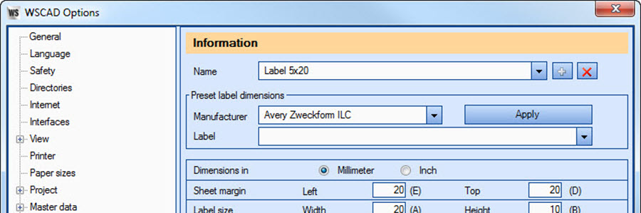 - Select one of the predefined label paper templates for different manufacturers in the Preset label dimensions area and click Apply. The predefined values are transferred to the table below.