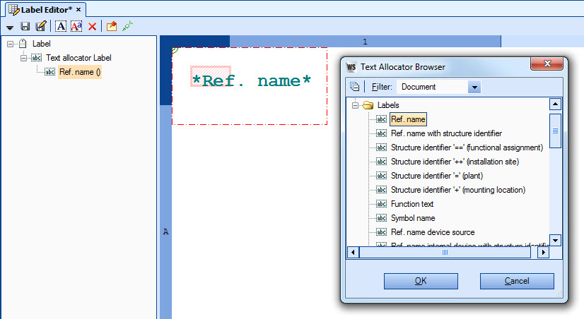 4. Click on the Insert general text as text allocator symbol button to insert one or more suitable text allocators (e.g., reference name) into this frame.
