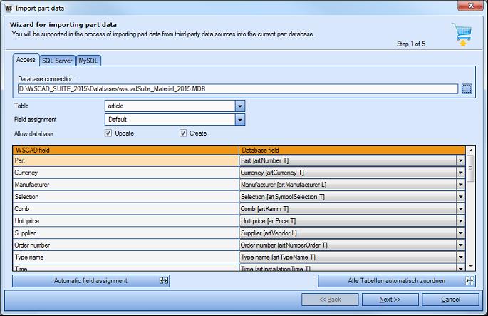 You can import the file formats *.MDB (Access), *.CSV (Excel) and *.wsIMA (ElectroCAD). For the WSCAD SUITE 201x and WSCAD 5.x databases, you can optionally assign the database fields to the WSCAD SUITE 2017 database fields manually or automatically.